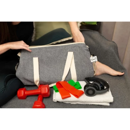 Torba sportowa, podróżna wykonana z bawełny z recyklingu i poliestru z recyklingu, posiada certyfikat GRS (Global RecycIed Standard), duża przegroda główna na zamek błyskawiczny, uchwyty i regulowany pasek na ramię
